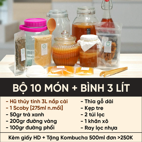 - Các thành phần còn lại như Scoby, Đường Vàng, Đường Phổi (đối với bộ 10 món), và dụng cụ không thay đổi.